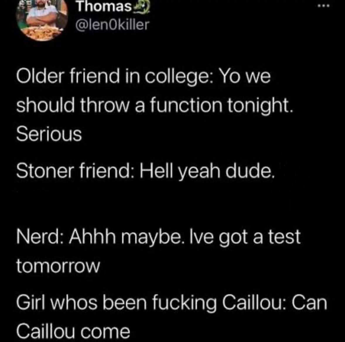 I’m not trying to say that all boyfriends who frequently spend time with their girlfriends’ friends are controlling, or that their presence inherently ruins the vibe. A lot of boys can, truly, be one of the girls. But if he’s got trust issues, trust me, the girls can tell. And if he just can’t go one night without you, that’s a red flag that your friends will eventually come to sense, too. Instead of always asking if Caillou can come, there are better questions to ask. Like, “How does everybody honestly feel about Caillou?” Or, “Do you guys think Caillou is getting a little codependent?”